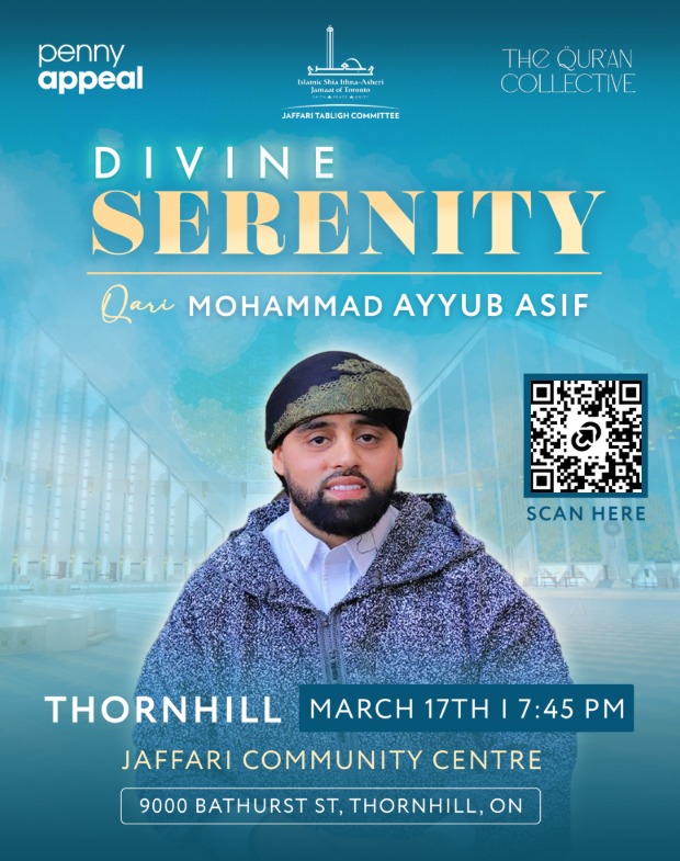As part of the Divine Serenity tour, Qari Mohammad Ayyub Asif is coming to the Jaffari Community Centre to guide us on a profound spiritual journey. As an internationally recognized Quran reciter and spiritual educator, he is widely respected for his captivating voice and deep connection to the Quran.